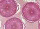 壁面にはピンクの光源をバックに自作プレパラートを展示。